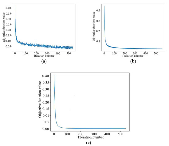 Figure 10a shows that the Contrast Source Inversion tends to stabilize after around 500 iterations, with the number of iterations being higher and more time-consuming. Figure 10b shows that the Deep Convolutional algorithm needs to iterate about 350 times to reach the stable range, and the training process is not smooth enough. Figure 10c shows that the Joint-Driven algorithm only needs about 60 iterations to reach the stable state, which greatly reduces the number of iterations, improves the imaging time, and smooths the training process.