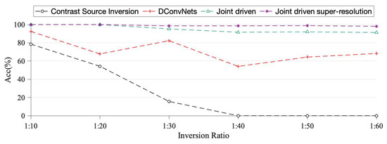 As can be seen from Figure 11, the Contrast Source Inversion can only invert the living tree burrow scatters with an greater than 1:30 and its application range is limited. Although the Deep Convolutional network algorithm can invert living tree burrow scatters with an , its accuracy is only about 70%, which cannot meet the actual requirements. The Joint-Driven algorithm proposed in this paper not only solves the problem of imaging the wood cross-sectional area with a small insect colony proportion, but it also has an inversion accuracy of up to 90% after the optimization of a specially-trained super-resolution network.
