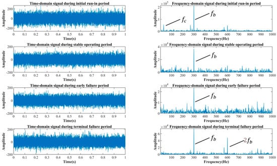 The operating information for the internal gear pump primarily includes the rotational frequency of the shaft, , the meshing frequency, , of the ring gear, and their multiplication frequencies. Figure 6 depicts the time-domain and frequency-domain signals for the internal gear pump during its four operating phases. In general, the signal-to-noise ratio of the raw signal in the four periods is low, and the signal is subject to significant mechanical vibration and environmental noise influences, causing , , and the multiplication frequencies to be obscured by the noises. Therefore, the signal cannot accurately reflect the operating data of the pump. Specifically, the signals during the initial run-in period and the early failure period have a large number of line spectrum clusters that are unrelated to the operating state of the internal gear pump, and their amplitudes are very high. If the signal features are extracted directly to identify the different operating periods of an internal gear pump, the accuracy will be low.