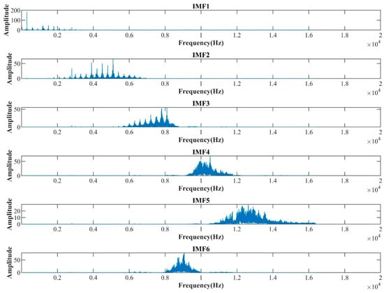 The signals for the four periods of the internal gear pump were subjected to VMD decomposition. Figure 8 depicts the frequency-domain waveform during the early failure period. Without modal aliasing, the center frequencies of the different modes are dispersed. Thus, the decomposition of signals with varying center frequencies was accomplished.