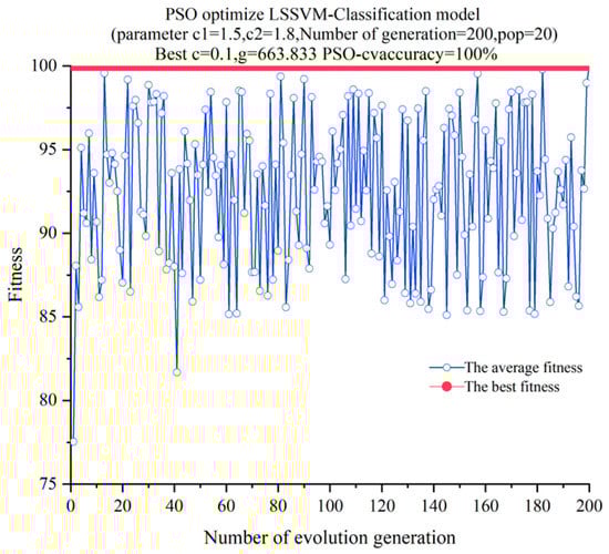 The training set was input into the PSO-LSSVM model for training and classification. The training utilized PSO–LSSVM. During the training process, the initial population number was set to 20, the i26teration time was 200, and the acceleration factors, and , were 1.5 and 1.8, respectively [23,26]. The fitness curve for the training process is depicted in Figure 10. The optimal fitness of the training samples was 100%, the kernel function parameter, , was 0.1 after PSO optimization, and the penalty factor, g, was 663.833.
