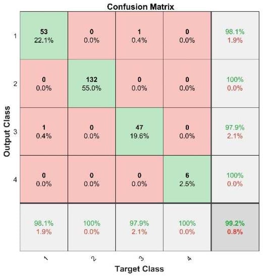 Figure 11 depicts the results of pattern recognition of the fault state in the test sets using the trained PSO–LSSVM model. The diagnosis rates for the internal gear pump’s four operating periods are 98.1%, 100%, 97.9%, and 100%, respectively. There were only two incorrect identifications among the 240 data sets: one data set from the initial running-in period was misclassified as an early failure period. In the early failure period, one data set was classified as the initial running-in period. The remaining classifications were all appropriate. Overall, the average diagnosis rate for the internal gear pump’s four operational periods was 99.2%.