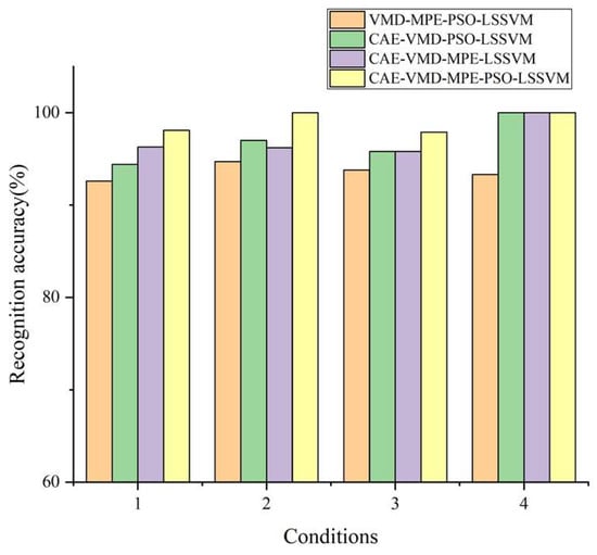To further validate the efficacy of the CAE–VMD–MPE–PSO–LSSVM method, it was compared to three other methods: VMD–MPE–PSO–LSSVM, CAE–MPE–PSO–LSSVM, and CAE–VMD–MPE–LSSVM. The results are shown in Figure 12. Each of the three methods has a diagnosis rate that is lower than the CAE-VMD-MPE-PSO-LSSVM method: 93.8%, 96.3%, and 96.3%, respectively. In addition, the diagnosis rate is significantly decreased when the raw signal is not denoised by a CAE, proving that CAE preprocessing of a signal with a low signal-to-noise ratio is effective for enhancing the fault diagnosis accuracy. However, CAE, as a deep learning model, is used for the preprocessing of vibration signals, which have a large amount of calculation and high model complexity. VMD is also used for signal decomposition, which has a large amount of calculation, resulting in the CAE-VMD-MPE-PSO-LSSVM method for internal gear pump fault diagnosis. There are also problems such as low computational efficiency and high model complexity, and it is difficult to achieve real-time monitoring of the health status of internal gear pumps. This issue can also be the focus of further research.