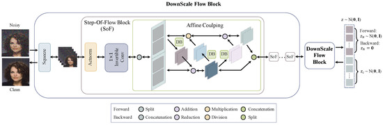 Our FDN Network Architecture. FDN consists of several invertible DownScale Flow Blocks. Module DB is the Dense Block proposed in [30]. The forward pass encodes the corrupted image to latent variables , which follow a Gaussian distribution, i.e., . The latent representations of noise are set to , combined with the clean latent variables as a new latent representation . The backward pass decodes to the denoised image.