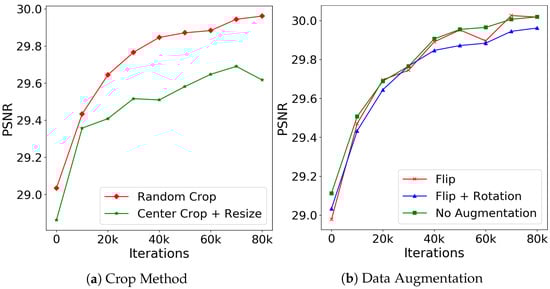 Thus, we compare training with random crop and center crop with resizing, illustrating the curves of the validation results in Figure 5a. Contrary to our intuition, cropping training patches randomly outperforms the center crop with resizing consistently and significantly. Therefore, we apply random crops while training the FDN.