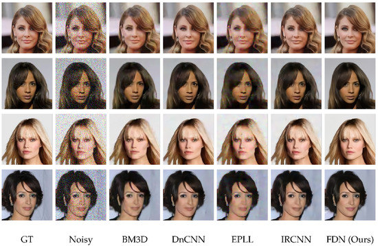 Image denoising results of FDN on CelebA dataset with against competitive methods. Our network produces results close to the ground-truth without any kind of deformation or artifact. The effects are best viewed zoomed-in.