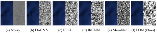 Qualitative Results. The visual results are illustrated in Figure 9 (Although in RGB images, blacker pixels represent smaller values, we change every pixel in the right regions by using 255 minus the value; thus, the whiter regions are smaller.). The remote sensing datasets are mainly composed of images with two types of regions: the texture regions such as mountains, and the smooth regions, such as deserts. An example of the smooth region from RICE1 with is taken. Our FDN outperforms other methods significantly from the right regions of Figure 9b–f. Thus, our distribution learning and disentanglement based denoising method, i.e., FDN, has proven to be effective not only for category-specific data but also for images following more complex distributions.