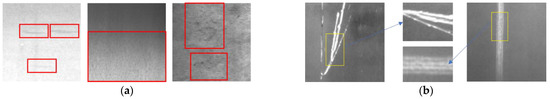 Figure 1. Challenges of defect inspection. (a) shows the low contrast between defects and background in the image. (b) shows the intra-class difference. - Intra-class difference, as shown in Figure 1b. As a result of the inhomogeneity of the production process, the measurement, silhouette, and other characteristics of similar defects are quite different.