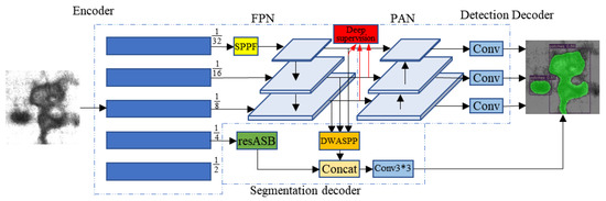 Our model mainly consists of three parts: encoder, segmentation decoder, and detection decoder. The encoder uses CSPDarkNet53 as the backbone and FPN for semantic feature enhancement. The encoder is trained in a deeply supervised way during training. The detection decoder uses PAN on the basis of the backbone for spatial information enhancement. The enhanced information is then used to make predictions. The segmentation decoder uses the DWASPP module for semantic information enhancement and the resASB module for spatial information enhancement, respectively. After the two are fused, segmentation prediction is performed. Finally, the prediction result of the detection decoder is combined with the result of the segmentation decoder to obtain the final prediction result.