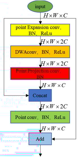 The resDWAB uses an inverted residual model. First, use point convolution to increase the number of channels, then use depth separable atrous convolution for feature extraction, and then use a point convolution to compress the number of channels. Finally, it is concatenated with the features of the previous layer then a point convolution is used for feature fusion. We borrowed the inverted residual structure of MobilenetV2. The depthwise separable convolution is replaced by the depthwise separable atrous convolution, and a feature concatenate path is added to match the atrous convolution to obtain richer multi-scale information. However, an excessive dilation rate will cause a lack of spatial detail information, so we choose to set the dilation rate of the three DWACBs to 0, 1, and 2, respectively.