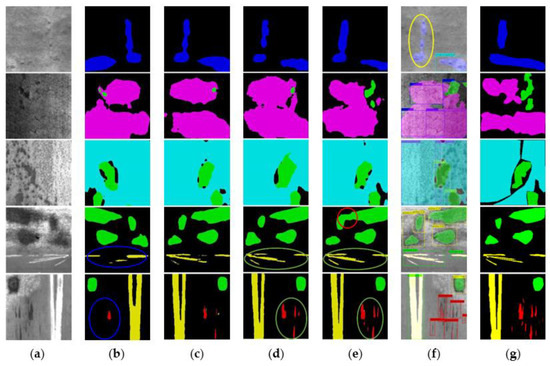 As shown in Table 6, we compare our model with yolov5s, Faster-RCNN, DIN of Hao et al. [35], and DDN of He et al. [64] Faster-RCNN achieves the worst detection performance due to its fixed detection window and underutilization of contextual information. Hao has made many improvements on the basis of Faster-RCNN and achieved a large performance improvement. The model has achieved the best results, but the improvement is limited, and the detection speed is too low to be practical. Our model benefits from the advantages of multi-task networks; the mAP metric is 0.69% higher than the original yolov5s. A detailed analysis of the indicators of specific defect categories shows that the Pa indicator dropped by 4.33%. It should be because the segmentation effect of the Pa class is not as good as the detection effect, which drags down the performance of the detection to a certain extent. The Cr class is also reduced because the segmentation effect is not good enough. Pt and Ri obtain higher enhancements from the segmentation-optimized feature maps, increasing by 3.23% and 6.14%, respectively.