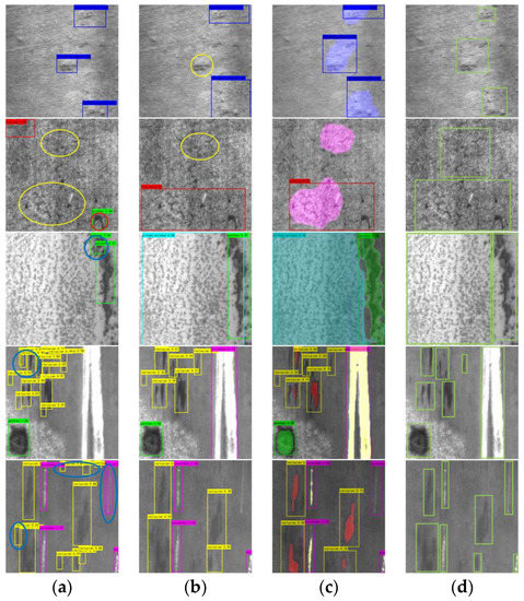 Through the analysis of the above results, we believe that the six common surface defects of steel strips have different types of characteristics. In, Pa, and Sc have clear boundaries and strong instance features, which are very suitable for object detection algorithms. Cr and Ri are more like a textured pattern without sharp boundaries, which deteriorates the object detection performance. Pa and Pt have large scales and high contrast with the background, which are very suitable for semantic segmentation algorithms. In and Sc have high contrast with the background, but there are too many small complex structures, which makes accurate segmentation difficult. Although Cr and Ri are more like a textured pattern, they have little effect on the semantic segmentation algorithm. The only difficulty is that the contrast with the background is too low.