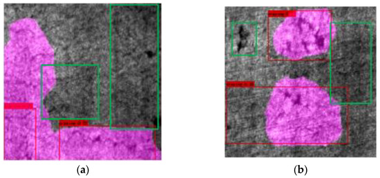 Failure analysis. (a,b) show failed predictions. The green boxes in the figure are undetected defects.