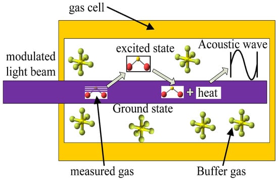 The modulated light beam enters the gas cell and transmits along the axis of the gas cell. The gas molecules absorb the light at certain wavelengths and are excited from the ground state to the excited state. Some of the excited gas molecules transition back to the ground state via nonradiative transition and release the absorbed energy in the form of molecular average kinetic energy. The internal energy of the gas molecules ascends. Consequently, acoustic waves are generated by this periodic heating. These acoustic waves can be measured using a microphone and are converted into electrical signals.