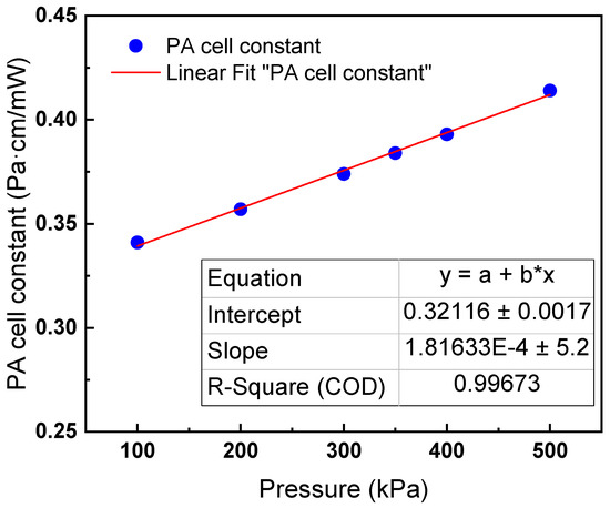 where γ is specific heat ratio of the buffer gas, ω is modulated frequency of the source light, a is the cross-sectional radius of the PA cell, κ is thermal conductivity of the buffer gas, ρ is the gas density of the buffer gas, and CP is heat capacity at a constant pressure of the buffer gas. The parameters and calculated PA cell constant (a = 6 mm, ω = 2π × 40) at 30 °C are listed in Table 1. Additionally, the PA cell constant along with pressure is plotted in Figure 2. Figure 2 shows that the relationship between them is approximately linear when the pressure increases from 100 kPa to 500 kPa. The PA cell constant can be approximately expressed as