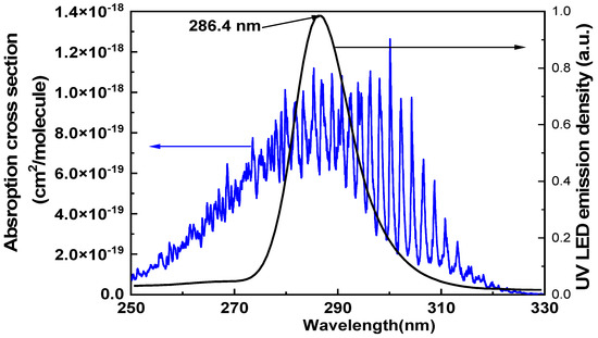 To improve the detection capability, crossover interference should be avoided as much as possible. Luckily, there is no or very weak absorption among 240–330 nm for all the SF6 decomposition gases. To reach the chosen range, a UV LED (M285L5) with a nominal wavelength of 285 nm and a bandwidth of 13 nm was selected as the light source. The typical output power of the LED can reach 70 mW. The emission spectrum of the UV LED is demonstrated in Figure 5. The absorption cross sections of SO2 from 250 nm to 310 nm are depicted in Figure 5 as well. It can be seen the actual central wavelength of the LED is 286.4 nm and that the bandwidth is about 12.5 nm. Meanwhile, the emission spectrum of the LED can cover most of the absorption band of SO2. This coverage makes strong excitement of the PA signal possible. Moreover, a condenser lens (aspheric lens UV-Coated, ASL2520-UV) is used to decrease affections of the divergence angle of the LED source and to increase the PA effect.