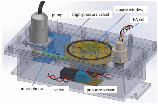 To realize the measurement of high-pressure gas, a gas vessel is specially designed, as shown in Figure 6. The PA cell, microphone, solenoid valves, and other components are all fixed into the high-pressure gas vessel, and the UV-light beam enters the gas chamber of the PA cell through a quartz window. The pressure sensor is fixed on cover plate of the vessel. The main reasons to use a double-layer structure are as follows: The increase in gas pressure increases the sealing difficulty of the microphone; moreover, the pressure tolerance ability of micro solenoid valves and the microphone is weak, and the risk of gas leakage increases when the pressure rises.