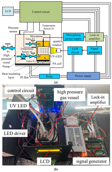 From Figure 7, a signal generator was employed to generate the LED driver (LEDD1B) modulation signal as well as the lock-in amplifier (LIA-BVD-150-L, FEMTO, Germany) reference signal. The LED driver modulation signal was a sine waveform with DC bias, the amplitude of the wave was set as 5 V, and the frequency can be altered. The LED driver was set to Modulation Mode. The output current of the LED driver could follow the amplitude of the input sine wave. The LED driver was connected to the selected UV LED. At the same time, a TTL synchronization signal was output to the lock-in amplifier by the signal generator. The PA signal was collected by the microphone and transferred to the lock-in amplifier. The amplified signal was sampled and processed by the control circuit board. Then, the results were displayed on the LCD. Sensors were used to monitor temperature of the PA cell and gas pressure of the high-pressure vessel. The temperature of the PA cell was controlled using a PI heating film.