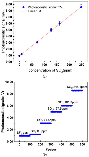 Detection properties of the SO2 detection system: (a) the linearity of the PA signal response and (b) series of measured results of different SO2 concentrations.