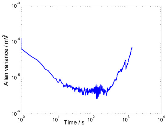 To evaluate the stability of the detection system, the PA cell was filled with pure SF6 gas, and then, an experimental test lasting 3000 s was performed. The Allan variance curve is shown in Figure 9. The minimum Allan variance is ~2.63 × 10−6 mV2. Moreover, when evaluating the minimum DL of a measuring instrument, the root means square of the Allan variance can usually be used as the minimum standard deviation of the measuring instrument. In this work, the minimum standard deviation is . Therefore, according to Equation (10), the minimum DL of the system is ~52 ppb.