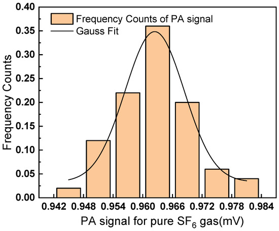 To perform the measurement precision analysis, the pure SF6 gas was measured 50 times continuously. The measured results were plotted in a column graph, as shown in Figure 10. The horizontal axis represents the PA signal range, and the vertical axis represents the frequency count. Then, the graph was fitted with a Gaussian profile. The expected value of the Gaussian distribution is 0.962 mV, the standard deviation is 5.98 µV, and the half-width at half maximum (HWHM) is 7.05 µV.