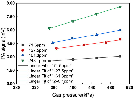 Temperature of the PA cell was controlled at 30 °C, and the modulation frequency of the UV LED was controlled at 40 Hz. Standard SO2 gases with concentrations of 71.5 ppm, 127.5 ppm, 161.3 ppm, and 248.1 ppm were tested using the mentioned method. The pressure of the gas mixture varies from about 350 to 500 kPa. The measurement results are shown in Figure 12. The linear fitting parameters and deviation induced by pressure fluctuation are listed in Table 3.
