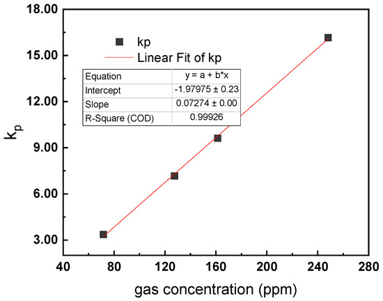 According to the experimental data in Figure 12 and Table 3, when the gas volume fraction c is fixed, the PA signal of the mixture gas increases gradually with the increase in the gas pressure, and the relationship is approximately linear. The slope of the change can be recorded as kp. When the gas volume fraction c changes, kp will also change. The relationship between kp and the gas volume fraction c can be obtained by fitting the experimental data, as shown in Figure 13.