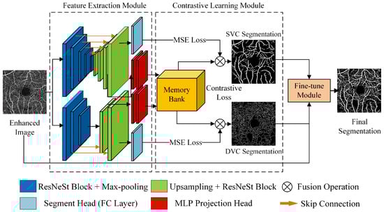 We propose a fully-supervised contrastive learning model for retinal OCTA image segmentation called contrastive OCTA segmentation net (COSNet). This method is mainly divided into three parts: feature extraction module, contrastive learning module, and fine-tune module, as shown in Figure 1.