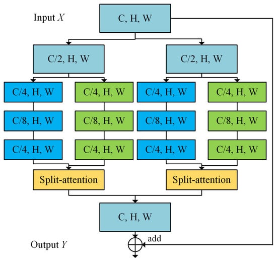 The variables C, H, and W represent channels, height, and width, respectively, of the feature map. The feature input is divided equally into K cardinal groups, which are then fed into R identical cardinal blocks. Thus, the initial input feature map is divided into G (G = K × R) groups along the channel dimension. Each branch contains the structure of “1 × 1 convolutional layer + BN + Relu” and “3 × 3 convolutional layer + BN + Relu”, resulting in a feature map with one-fourth of the original channels. In addition, each cardinal block is followed by a split attention to integrate feature map.