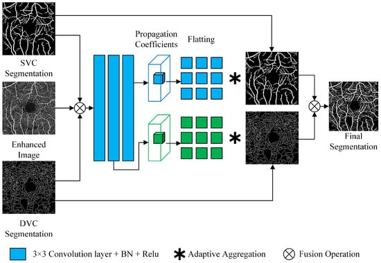 First, the SVC prediction map, DVC prediction map, and original image (all single channel) obtained from the previous module are channel-fused into a 3-channel input. The input passes through two and three convolutional layers (DVC and SVC), respectively, and then this module generates a normalized local propagation coefficient mapping of size , for all positions of the output of the convolutional layers, denoted as Equation (8), where denotes the confidence value of neighbor P at position i, and is the size of the propagating neighbor.