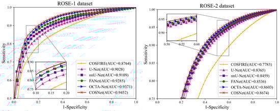 Except for FDR in Table 3, COSNet obtained the best performance. Although COSFIRE achieved the best score on the FDR metric, it was significantly lower than the deep learning method on other metrics. The filter-based method worked better on the simple structure of vessels. However, in the ROSE dataset, the superficial and deep microvascular structures are highly dense and intricate, which makes the segmentation effect of the traditional method poorer. In addition, the artifacts, low resolution, and low contrast of OCTA imaging also increase segmentation difficulty. In contrast, deep learning methods can extract higher-level distinguishing representations from local and global features, resulting in better performance on segmentation tasks. To visualize segmentation performance of different methods, we show the ROC curves for ROSE-1 and ROSE-2 in Figure 6. The comparison of segmentation results is also shown in Figure 7 and Figure 8. (We mainly focus on tasks containing two kinds of annotations, so only the results of ROSE-1 are shown).
