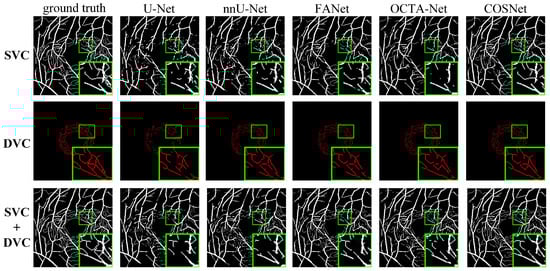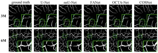 Deep learning-based segmentation methods are superior to traditional methods such as COSFIRE for the OCTA image segmentation task. The basic structure of these segmentation networks is “encoder + decoder”, which is able to extract the deep semantic information. In addition, the use of various attention blocks can also help to improve the AUC score, such as the feedback attention mechanism of FANet. The COSNet proposed in this paper outperforms other approaches not only by using the ResNeSt block as the backbone of the “encoder + decoder” structure, but also by adopting a new pixel contrast loss function, which improves the information extraction ability of the network under the scenario of class imbalance. In addition, the fine-tune module can refine position information of DVC. From the green box in Figure 7 and Figure 8, it is easy to see that the previous methods have more breakpoints at deep vascular locations. In contrast, COSNet outperforms the other methods in the scenario of complex structure and class imbalance of microvessels.