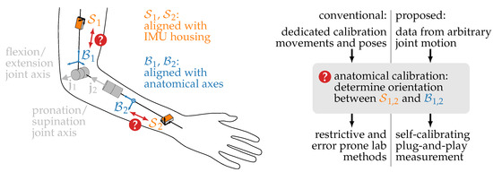 However, in order to derive anatomically meaningful kinematic quantities, for example, joint angles, the orientation of each IMU with respect to its body segment must be known, as illustrated in Figure 1. Even small misalignments between the assumed and actual orientation of the IMUs on the body lead to errors in the obtained kinematic quantities. To ensure accurate motion tracking, it is therefore desirable to accurately determine this orientation. In practice, this is often achieved by manual placement of the IMUs on the respective body segments in a specified orientation [3], which is error-prone, especially when the attachment of sensors is to be performed by patients or by non-medical personnel.
