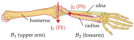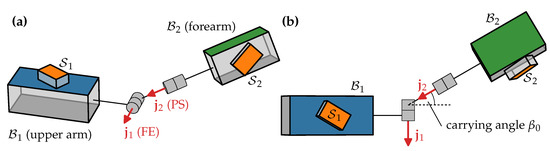 The scalars and are the rotation rates of the joint around the respective joint axes. In case of joints with two degrees of freedom according to the model in Figure 3, this corresponds to the anatomical joint motions, i.e., in case of the elbow, is the FE angular rate and the PS angular rate. This means that the angular rate measured by the forearm IMU is composed of three components: