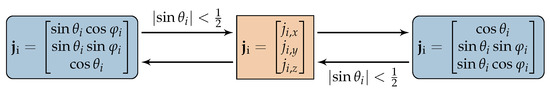 Two spherical parametrizations are used to represent the joint axes , , with two parameters each, and . To avoid the derivative becoming close to zero, we convert the respective axis to Cartesian coordinates and then to the other representation whenever .