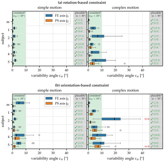 Using the optimization results, we calculate FE and PS joint angles based on the ISB recommendations [45]. Those joint angles are defined as intrinsic Euler angles of the forearm relative to the upper arm , i.e., , with and being the segment coordinate systems as defined in [45].