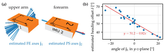 The heading offset has an unknown initial value and then slowly drifts due to gyroscope bias [49]. Please note that both and have some unknown heading offset with respect to a fixed frame used in 9D sensor fusion and defined by gravity and the Earth’s magnetic field. However, knowing those individual offsets is not necessary for calculating relative orientations and joint angles.