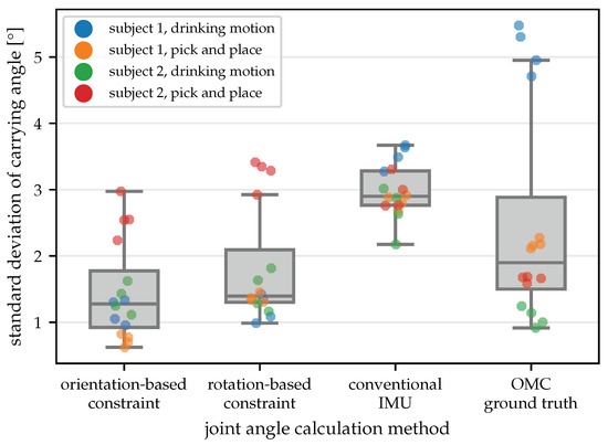 The second experiment is designed for the evaluation of the accuracy of the obtained joint angles with the proposed self-calibrating magnetometer-free joint angle calculation method. This experiment consists of recordings of natural everyday life motions of two subjects. It uses marker-based OMC as a reference, which allows for the comparison of the obtained joint angles to joint angles obtained from optical markers and from a conventional 9D IMU-based approach. As a further validation step, we consider the variability of the expected-to-be-constant carrying angle as a metric for how well the estimated joint axes describe the functional joint motion.