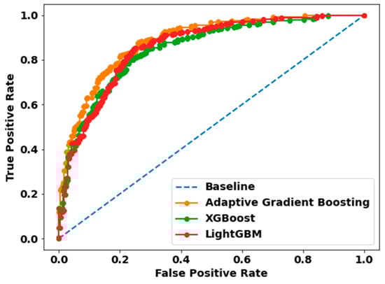Receiver Operating Characteristic (ROC) curves of the Adaptive Gradient Boosting, XGBoost, and LightGBM classification models. The orange ROC curve represents Adap-tive Gradient Boosting with AUC (80%), the green ROC curve denotes XGBoost with AUC (77%), and the red ROC curve refers to LightGBM with AUC (78%). The area under the ROC curve (AUC) indicates the accuracy of a prediction. The diagonal blue dot line is the reference line.