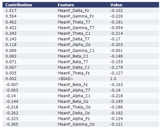 As shown in Figure 4, the most contributing feature are MeanP_Delta_Fz, MeanP_Gamma_T7, and MeanP_Gamma_Fz for an example test instance using the XGBoost model. The contribution of these three features are 1.05, 0.237, and 0.235 respectively. As shown in Figure 5, the most contributing feature are MeanP_Delta_Fz, MeanP_Gama_Fz, and MeanP_Theta_T7 for an example test instance using the LightGBM model. The contribution of these three features are 1.517, 0.564, and 0.462 respectively.
