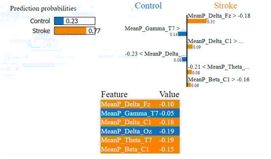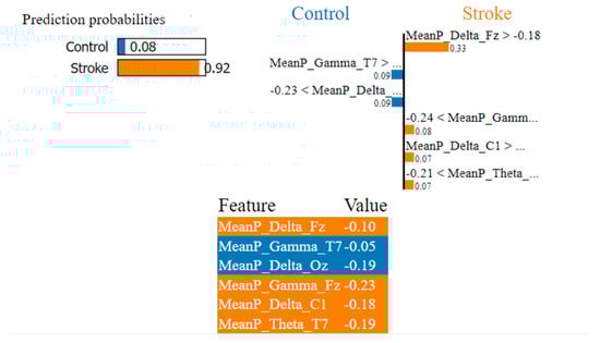 In Figure 7, the LIME visualization is reported for the XGBoost model to predict an instance, the control or stroke class. The predicted probability of the test stroke instance and control instance is 77% and 23% respectively. The three most contributing features of this model are MeanP_Delta_Fz, MeanP_Delta_C1, and MeanP_Theta_T7 to predict a stroke instance. The feature importance of these three features are 31%, 9%, and 8% respectively. Higher frontal and central delta and temporal theta have a much greater contribution to the prediction of stroke using the XGBoost model.