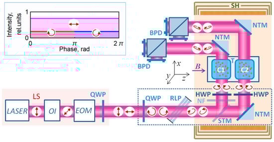 The measurements were carried out on the setup described in [23,25,40] and modified in accordance with the task of the experiment. The light source (LS) consisted of an external cavity diode laser (VitaWave ECDL 895R) generating about 25 mW at a wavelength of 894.592 nm, an optical isolator, and an electro-optical modulator (Thorlabs EO-AM-NR-C1). The control voltage at the EOM, modulated at a frequency of ~42 kHz with an amplitude of 200 V, provided a phase shift of ±45° between the components of the light decomposed along the EOM’s own axes. An additional QWP (quarter-wave plate) provided linearly polarized radiation with modulated azimuth generation at the output of the radiation source.