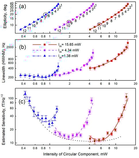 Dependence of the parameters of magnetic resonance when pumped with light with modulated ellipticity on the light intensity at the input of the cell: (a) ellipticity for different numbers (indicated by numbers in the graph field) of glass plates in a linear polarizer; the black circles indicate the optimal ellipticity values for this series, (b) magnetic resonance half-width, (c) estimation of the ultimate (limited by calculated shot noise) sensitivity. Connecting lines are guides to the eye.