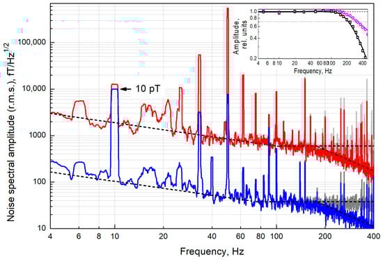Noise spectrum of the magnetic resonance signal in cell C2 (red line), and the difference signal of magnetic resonances in cells C1 and C2 (blue line)—moving r.m.s. average in 1 Hz band. Gray lines are the spectra corrected for the frequency response of the sensor. The peak at a frequency of 10 Hz (marked with an arrow) is a calibration signal with an amplitude of 10 pT r.m.s. The peak at a frequency of 50 Hz is the interference from the main currents. The dashed lines are the noise floors of the signal in cell C2 and of the difference signal, respectively. Inset: the magenta line is the sensor’s frequency response (cutoff frequency f0 = 315 Hz), the black line is the sensor’s frequency response, taking into account the time constant of the SR830 synchronous detector (τ = 0.3 ms, 18 dB/octave).