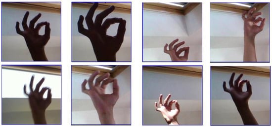 Python version 3.7.2, PyCharm development environment and the Keras and TensorFlow libraries for creating, training and presenting the test results of the convolutional neural network were used to create the model. Additionally, the Flask framework was used to create the web application. The training set consisted of 50,000 photos with dimensions of 200 × 200 pixels, consisting of 26 characters of American Sign Language letters and downloaded from the online data science platform Kaggle. In the photos, the hand presenting the sign language gesture (interpreted in sign language as a sign of the alphabet) is presented in different lighting and in a different configurations. Examples of photos for a single letter are shown in Figure 1.