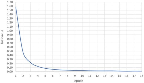The primary parameter verifying the usefulness of the network is the so-called loss-function curve, shown in Figure 3. It returns information about the results of the network learning process. If the network prediction results in misses, the value of the loss function is high; otherwise, it is low. The estimated function value is expected to decrease with each successive learning cycle. The graph presented in the figure represents that the loss function for the analysed network in the first learning cycle has a high value that decreases with each run cycle and approaches zero. The desired result was achieved when the number of missed responses of the neural network decreased with each learning cycle.