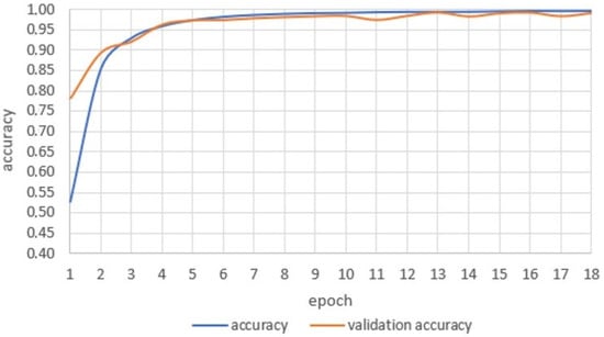 Starting from the third learning cycle, the values of both functions are similar. Based on the obtained results, it may be concluded that there is no overfitting phenomenon in the analysed network, and thus the network should have a high ability to recognize unknown objects. The created neural network was validated after the learning process. The size of the test set was specified in the input module: the network uses 50,000 photos, and the value of the test set was 20%, i.e., 10,000 photos. With the presented architecture and the assumed parameters of the neural network, the accuracy of image recognition from the training set reached 99% correctness.