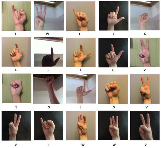 The suitability of the network for recognizing characters from previously unknown images was checked. For the purpose of this activity, 40 photos with information about the characters “L”, “I”, “W”, “V” and “S” were entered as the network input. The network was tested using an application developed for this work. Similar to the previous exercise, the photos of each letter show the hand with different backgrounds and under different lighting. A sample of the test data is shown in Figure 5.
