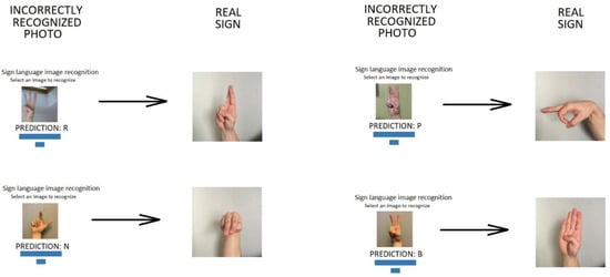 The test set includes photos taken on a green striped background. None of these were properly recognized. In terms of numbers 3 and 8, the character “P” was recognized, and for the number 4, the character “R”. An error for number 4 may have been the result of the similarity between the real “S” sign and that recognized by the neural network as “R”. For both signs, the thumb is placed the same way, although the letter “S” has a fully closed fist whereas for the letter “R” it is partially open. A similar situation occurs with misdiagnoses of 1, 6 and 7. Likewise, in these cases, there are similarities between the input character and the recognized character: each input character “W”, “V” and “I” requires showing one, two or three fingers, while the remainder stay joined. It is worth noting that, nevertheless, hand gestures for letters “R”, “B” and “J” remain similar to those for “W”, “V” and “I”, yet these were correctly identified.
