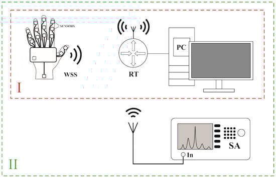 Three measuring stations were designed to test the adaptive data transmission algorithm developed for a system of inertial sensors. Figure 1 presents the structure of two measuring stations. The first station is marked with the Roman number I. It contains the WSS (Wearable Sensor System) described in detail in Section 2.2, router (RT) with an access point (RT-N10U) and PC server. The WSS radio transmits data from sensors in the Wi-Fi 2.4 GHz standard. The frames transmitted by the WSS were filled with data from the sensors, and the value of the transmission filter control parameter was simulated, which is described in Section 3. In turn, the RT receives Wi-Fi frames containing data transmitted by the WSS, and then the RT via a wire (cable with RJ45 plug) sends Ethernet frames using UDP (User Datagram Protocol) to the PC server, where the data are archived.